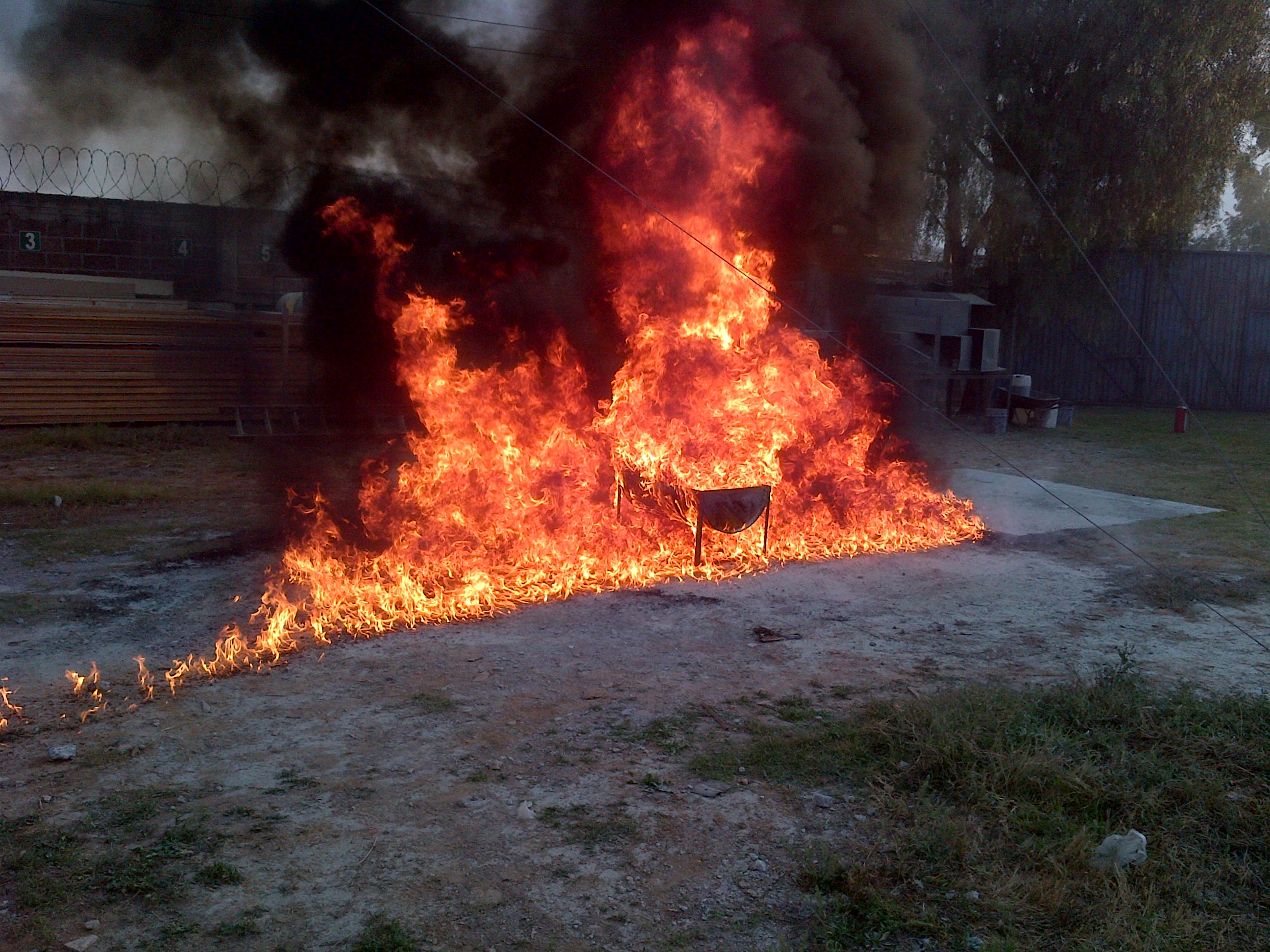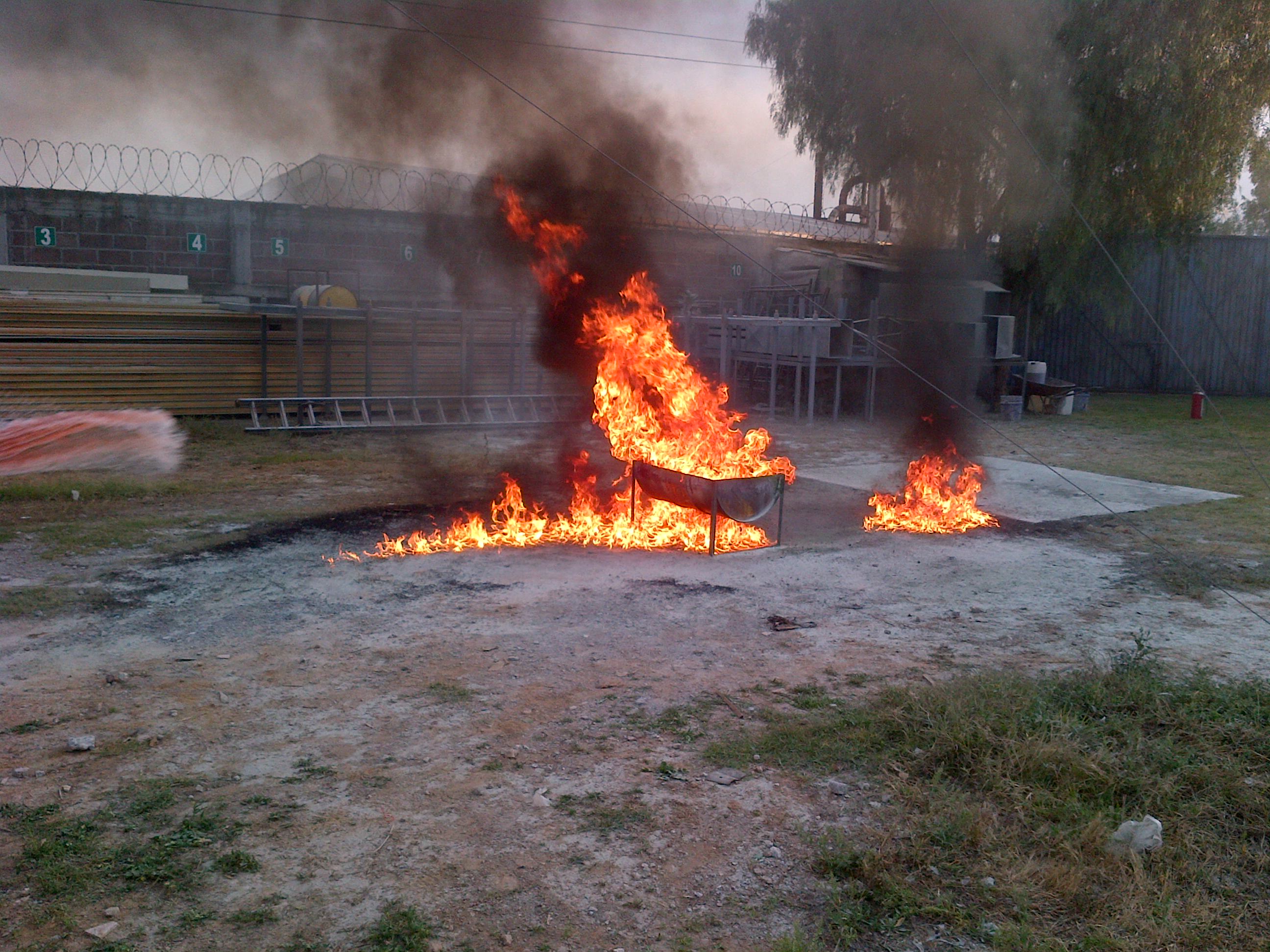 En esta practica se genera un fuego controlado con combustible dentro de un are abierta y se le pide a los participantes, previa capacitación que utilice el extintor para apagar ese fuego.